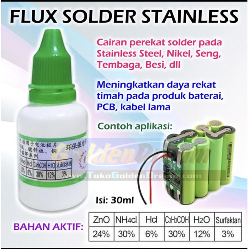 Isi 30ml (lebih banyak)Cairan perekat & penguat solder pada permukaan yg licin dan susah menempel dengan timah seperti:1. Stainless Steel2. Nikel3. Seng4. Besi5. Tembaga yg sudah kotor dllMemudahkan timah menempel pada:1. Kutub baterai2. Papan PCB3. Plat stainless4. Kabel lamadll**Kelebihan:1. Berbentuk botol tetes dengan tutup2. Aman di kulit, tidak berbahaya dan tidak mudah terbakar3. Berkualitas dan efektif4. Praktis dan mudah dipakai: cukup teteskan sedikit pada permukaan yg akan disolder**Spesifikasi:Wadah: botol tetesIsi: +/- 30mlKomposisi: cek foto* ZnO = 24%* NH4Cl = 30%* HCl = 6%* CH3COOH = 30%* H2O = 12%* Surfaktan