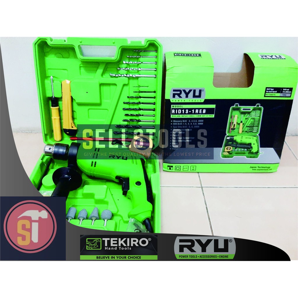Spesifikasi : Merk : RYUDaya Listrik : 600 WTegangan : 220 VKapasitas Chuck : 13 mmKecepatan Tanpa Beban : 0 - 2.800 RPMFrequency : 50 HzNetto : 3.200 GrMesin Bor Impact dari RYU (TEKIRO) ukuran 13 mm. Dapat menggunakan Mata Bor Besi hingga 13mm,Mata Bor Beton Hingga 16mm, dan Mata Bor Kayu hingga 20mm.Aksesoris :- 9 Pcs Mata Bor ( 1,5 mm - 8 mm )- 5 Pcs Mata Bor Grinder- Meteran 2M- Obeng Bolak Balik (Plus & Minus)- Cutter- Pensil Kayu- Sarung Tangan- Sekrup & FischerNotes :- Sebelum di kirim, barang telah kami cek terlebih dahulu.- Semua pengiriman aman menggunakan bubble wrap.- Apabila ada pertanyaan feel free untuk menghubungi kami melalui chat.- Pemesanan di bawah jam 4 akan kami kirimkan di hari yang sama.- Rekam paket saat dibuka adalah wajib jika ingin melaporkan adanya kekurangan / mesin yang bermasalah.Terima Kasih- Happy Shopp