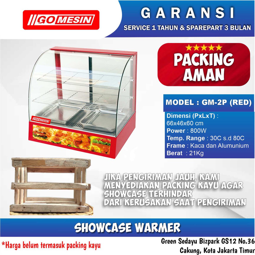 BE A SMART BUYER- Gomesin merupakan merk terbaru yang awal usahanya dirintis pada tahun 2014,jadi kami bukan pemain baru lagi di bidang ini- GOMESIN selalu menampilkan foto produk asli- Memiliki CS yg dapat memberikan bantuan perihal masalah apa saja mengenai produk GOMESINGOMESIN Adalah GUDANG NYA MESIN1. Mesin Unggulan untuk usaha anda2. Usaha tidak perlu mahal dengan GOMESIN3. Mesin Handal, Profit maksimal4. Bisnis jadi Juara bersama Go Mesin5. GO Mesin sumber inspirasi UsahaKeunggulan Gomesin:- Memiliki Garansi Resmi dari Gomesin (1 Tahun Service & 3 Bulan Sparepart)- Packing Aman (Menggunakan Peti Kayu)- Menyediakan jasa pengiriman untuk wilayah Jabodetabek (Free Ongir S&K Berlaku)- Untuk pengiriman di luar Jabodetabek bisa menggunakan jasa ekspedisi pilihan kami atau langganan bapak/ibu.Display warmer showcase merupakan mesin yang berfungsi untuk menjaga kehangatan makanan agar tetap fresh dan tahan lama. Display warmer ini juga berfungsi untuk memajang produk makanan yang dijajakan seperti pada Display warmer fried chicken contohnya. Mesin ini memiliki kaca yang transparan, sehingga mampu menjangkau penglihatan konsumen untuk memilih produk makanan lebih baik.Display warmer atau warming showcase dengan tipe GM-2P ini mungkin sering Anda lihat di berbagai Display warmer fried chicken. Mesin ini memiliki harga terjangkau dengan taya tampung yang cukup untuk Anda pemula bisnis. Warming showcase ini memiliki nampan air yang persis di bawah rak bertujuan untuk menampung minyak apabila makanan terlalu panas.Manfaat showcase1. Membuat makanan bisa di tata lebih rapih2. Bisa menjaga aroma makanan tidak keluar3. Membuat makanan anda lebih menarik dan cantik4. Bisa memanaskan dan menghangatkan makanan5. Melindungi makanan dari debu atau lalatSPESIFIKASIMODEL : GM-2PPower : 0.8 kWTemperature: 50 – 85CWeight : 65 kgMachine Size : 74 x 54 x 70 cmCatatan:1. Untuk berat barang standar (1-20kg) silahkan langsung checkout melalui jasa kirim yang sudah tersedia, gunakan JNE trucking untuk menghemat waktu dan biaya.2. Barang besar/berat lebih dari 20kg (berat dan volume) atau daerah tidak terjangkau, bisa kami bantu kirim menggunakan kurir toko atau ekspedisi lain atas persetujuan pembeli.3. Bayar di tempat berlaku untuk nominal dan barang tertentu.4. Bayar di tempat berlaku untuk wilayah JADEBOTABEK. HAPPY SHOPPIN