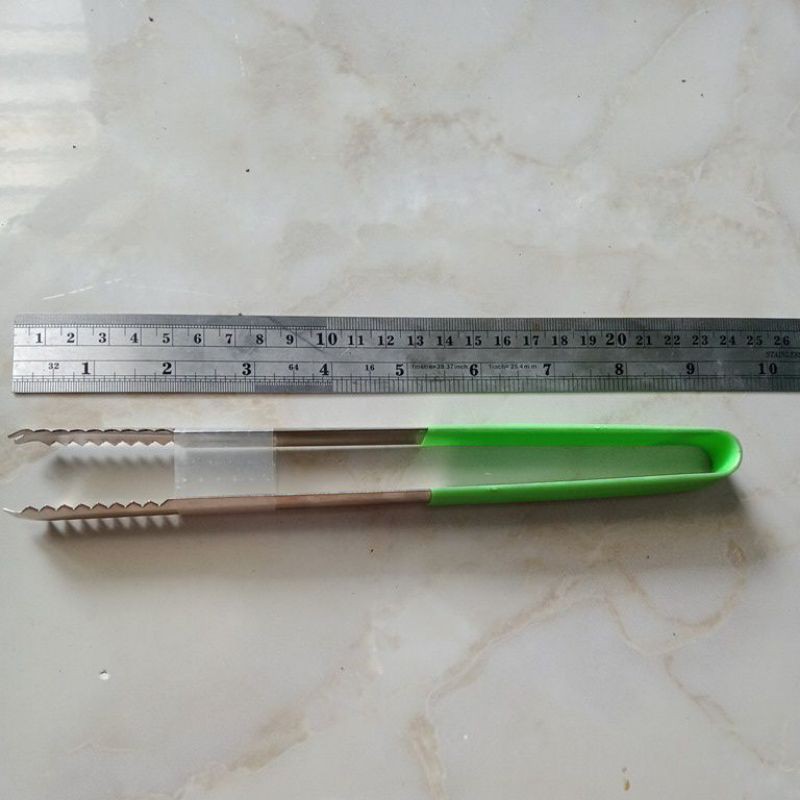 ukuran panjang 9cm.Capitan atau biasa dikenal penjapit makanan.ada varian warna merah.hijau,biru.tdk bisa request warna Krn tergantung stock yg ada. bahan kuat stainless steell dilapisi gagang karet anti panas. Tidak le