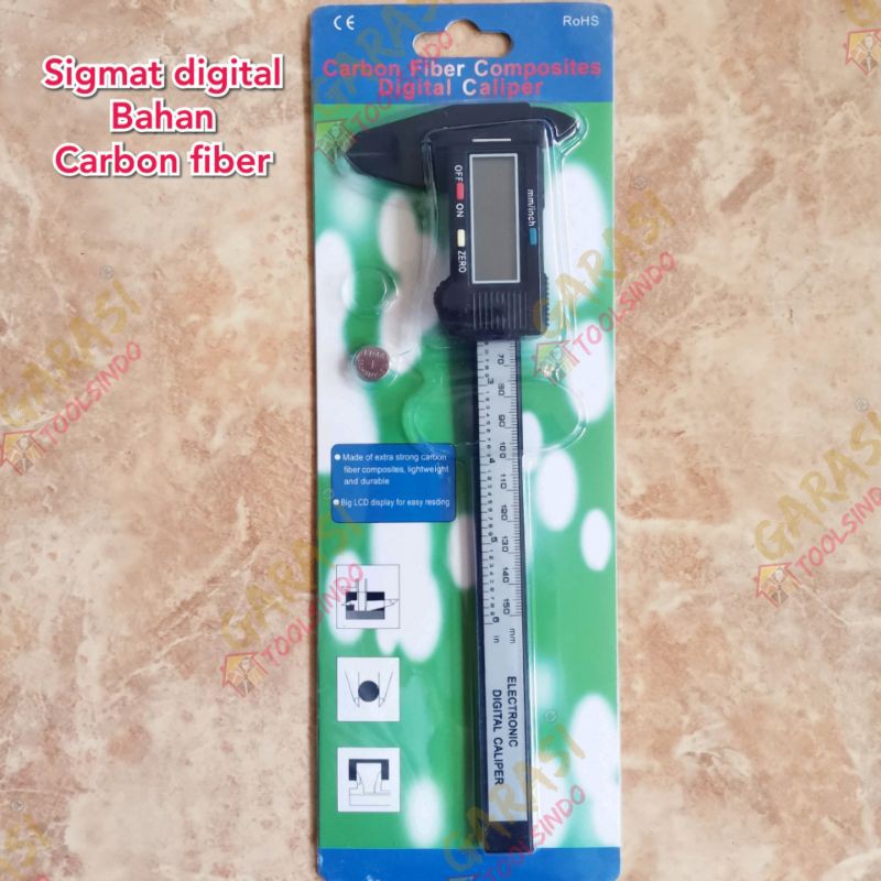 Material : PlasticOthers : Measuring range: 0150 mm/ 06 inchCaliper digital / Jangka sorong / Sigmat digital untuk mengukur panjang suatu benda dengan ketelitian sampai 0,1 mm, hadir dengan layar LCD untuk mempermudah Anda melihat hasil pengukuran. Terbuat dari bahan material carbon fiber.Resolution and AccuracyJangka sorong digital ini memiliki resolusi pengukuran sebesar 0.01mm / 0.0005 inch dan Accuracy: + 0.2 mmHigh Quality MaterialJangka sorong digital ini terbuat dari bahan material plastic.Easy to OperateJangka sorong digital ini sangat mudah untuk digunakan, cukup geser roda / slider sesuai ukuran yang dikehendaki, hasil pengukuran akan tampil pada layar